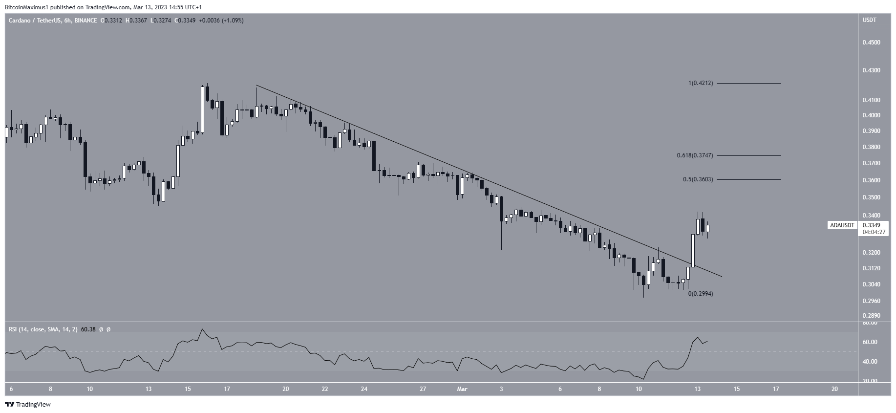 O preço da Cardano está em queda desde 16 de fevereiro, quando validou uma linha de tendência de alta como resistência (ícone vermelho). A queda levou a uma mínima de US$ 0,298 em 8 de março.