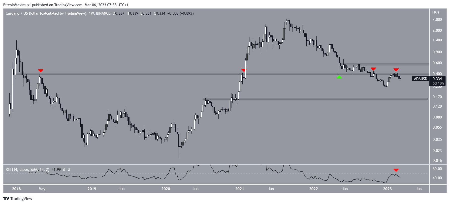A análise técnica do período diário mostra que a ADA caiu desde que validou uma linha de tendência de alta como resistência em 16 de fevereiro (ícone vermelho).