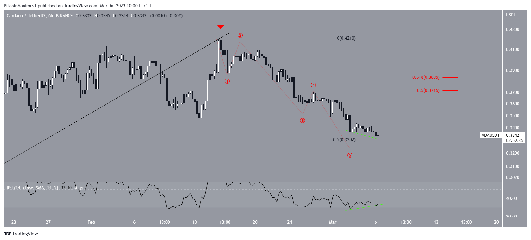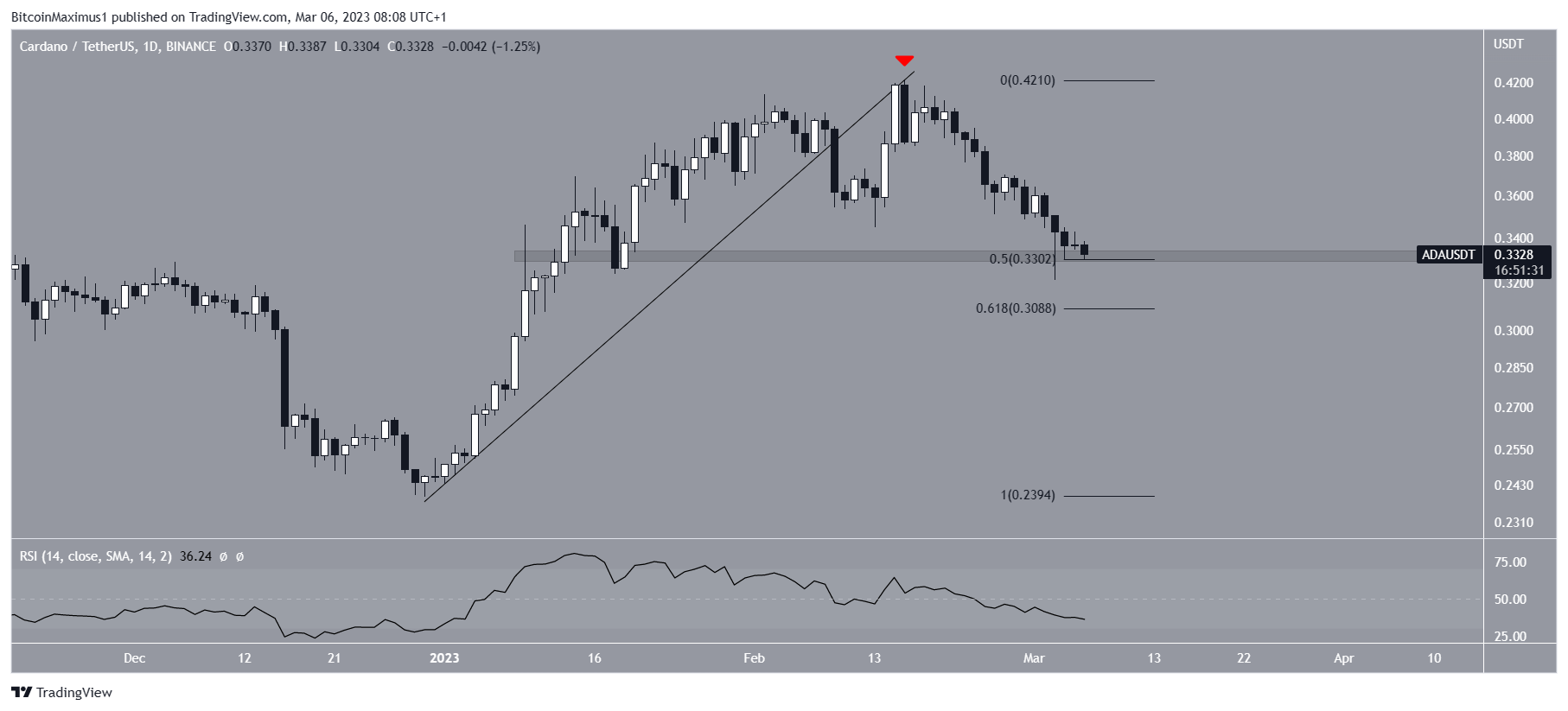Atualmente, a ADA é negociada no nível de retração 0,5 de Fibonacci em US$ 0,330. Esta é uma região de confluência de um nível de suporte horizontal e um suporte de Fibonacci. Portanto, o movimento da tendência futura será determinado se o ativo for rejeitado nessa região ou sustentar e saltar deste ponto.