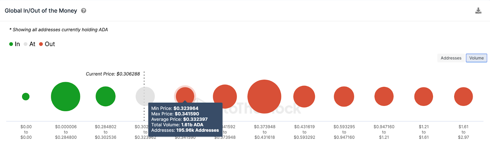 Sponsored SponsoredNo entanto, os touros estratégicos ficarão atentos ao nível de resistência de US$ 0,33. Conforme mostrado abaixo, 196.000 investidores compraram 1,61 bilhão de moedas ADA a um preço médio de US$ 0,33. A ADA pode entrar em uma retração intermediária se optar por sair de suas posições quando empatar.