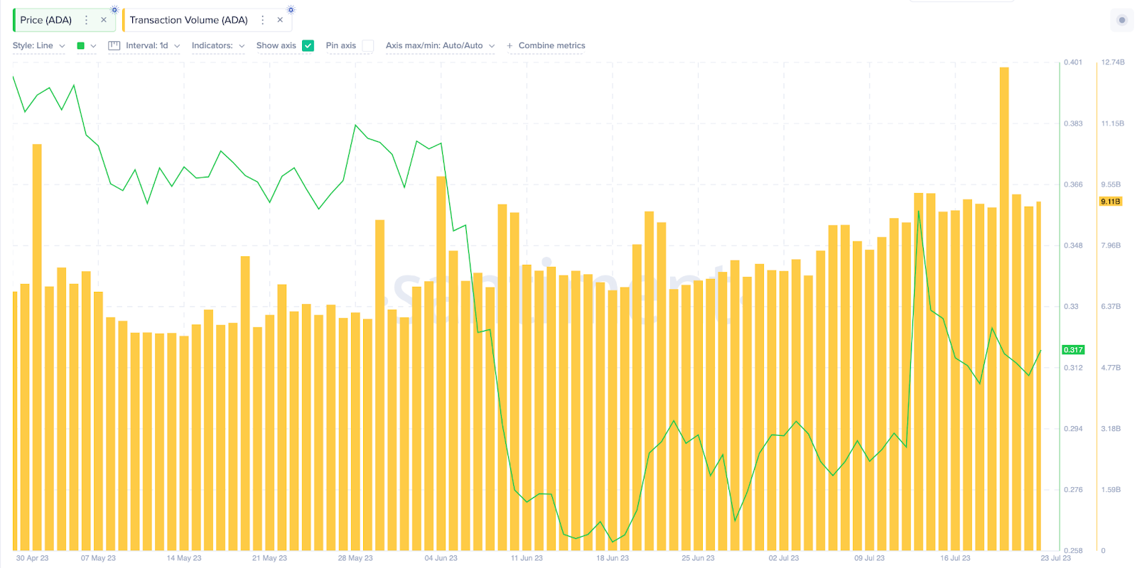 Os dados on-chain prestados pela Santiment revelam que atingiu um pico de volume de transações de 3 meses de 12,16 bilhões de ADA em 20 de julho.