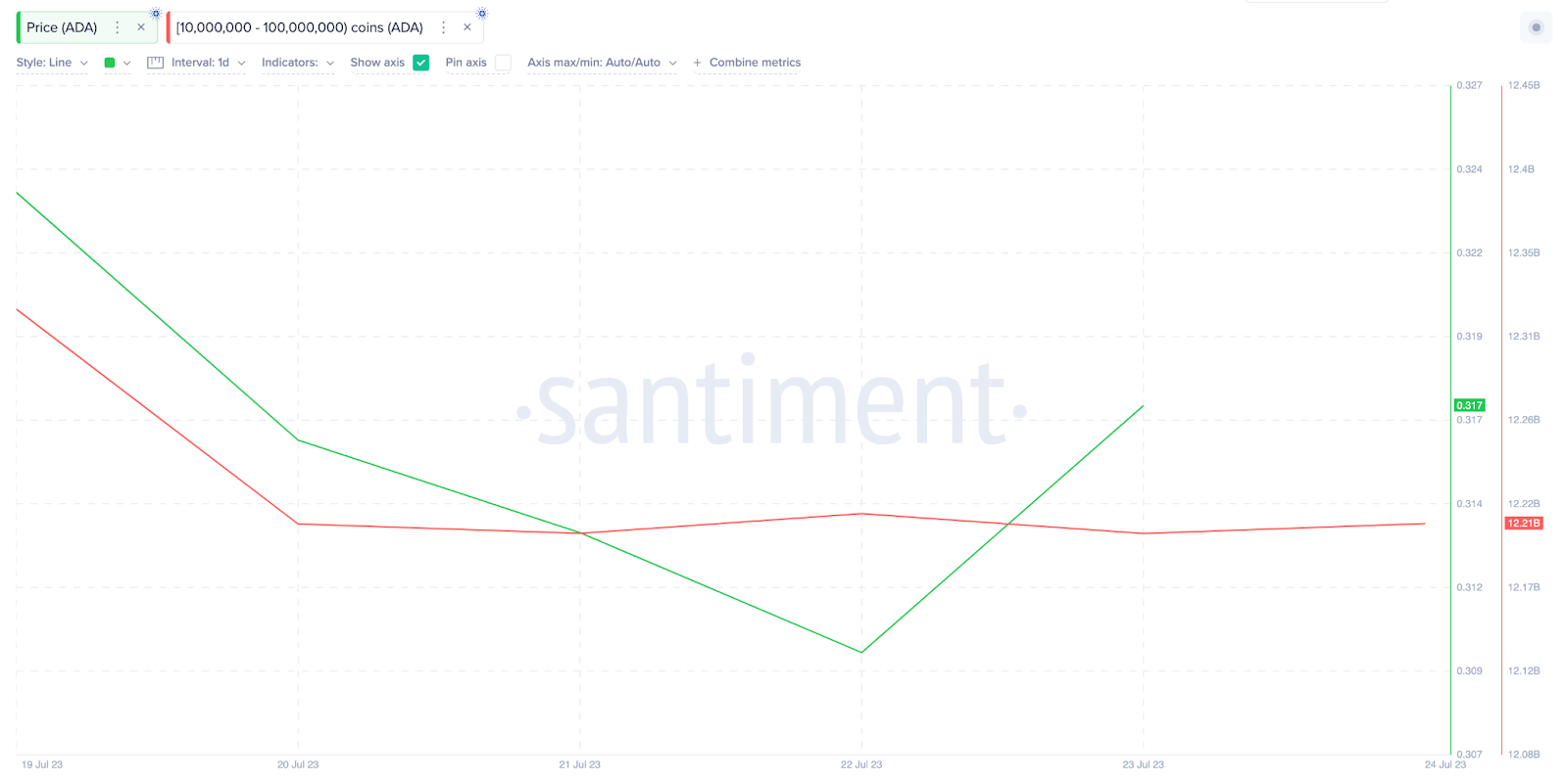 Além disso, embora a ADA não tenha gerado ganhos consideráveis na semana passada, os investidores baleias continuaram firmes em HODL. A Santiment relata que as baleias cripto que possuem de 10 milhões a 100 milhões de ADA mantiveram seus saldos relativamente constantes desde 20 de junho.