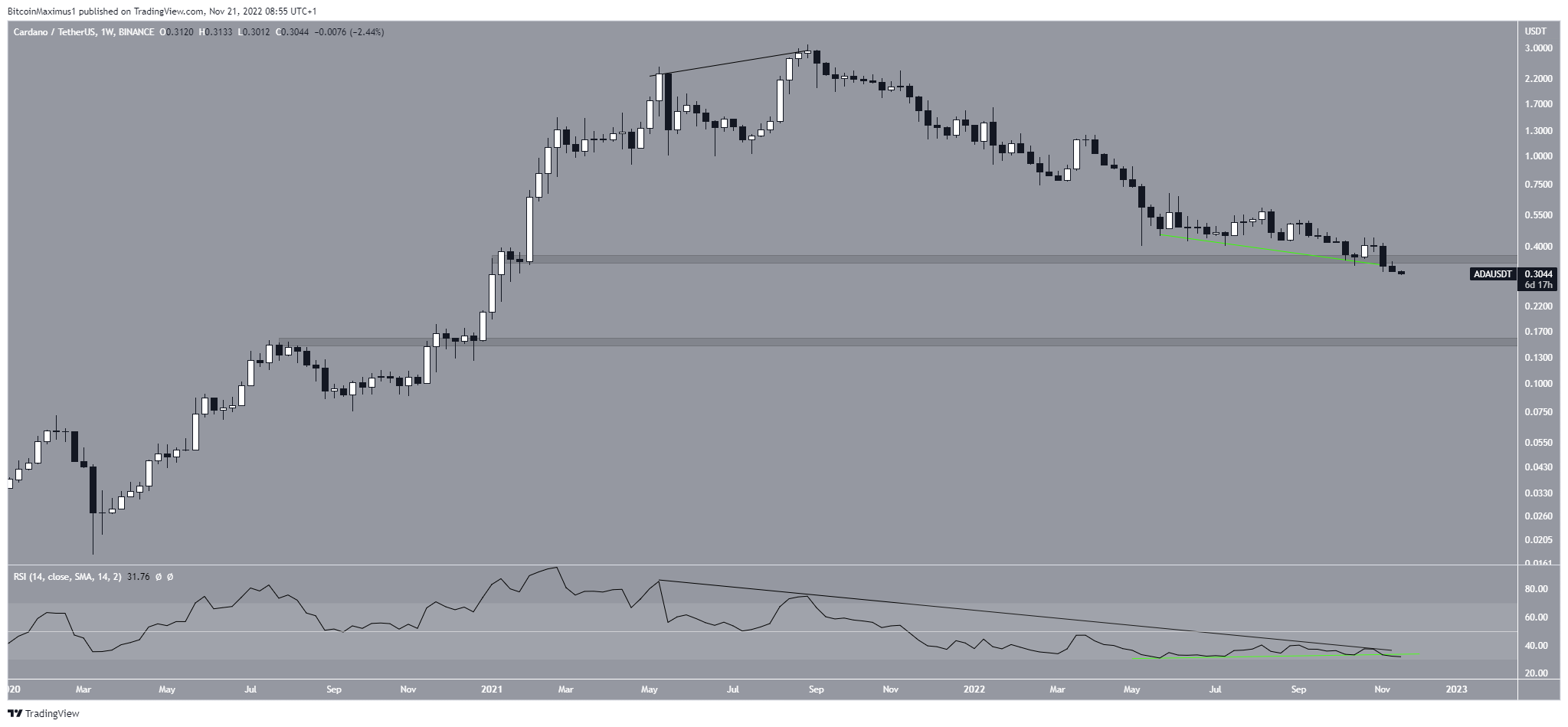 Toda a queda foi precedida por uma divergência de baixa no RSI semanal (linha preta), embora não houvesse notícias negativas da Cardano para afetar o preço. A linha de divergência de baixa ainda está intacta.