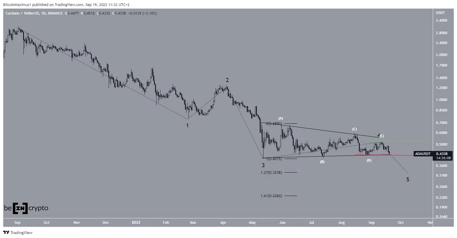 A ADA provavelmente está caindo em um movimento descendente de cinco ondas (preto) desde a alta histórica de agosto de 2021. Em caso afirmativo, apenas começou a onda cinco depois de completar a onda quatro dentro de um triângulo simétrico.