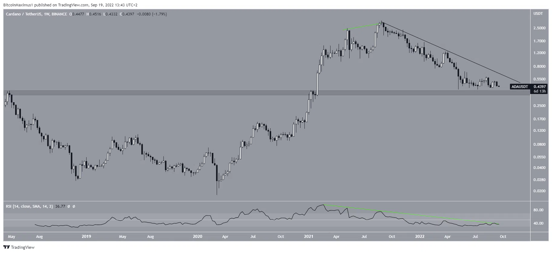 A ADA vem caindo abaixo de uma linha de resistência descendente desde que atingiu um preço recorde de US$ 3,10 em setembro de 2021. O movimento descendente levou a uma mínima de US$ 0,40 em maio de 2022.
