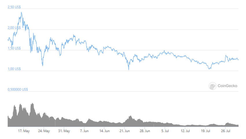 No momento, o ADA é negociado a US$ 1,27, caindo 1,1% nas últimas 24 horas, muito longe do recorde histórico de US$ 2,45 registrado em maio de 2021, de acordo com dados da CoinGecko.