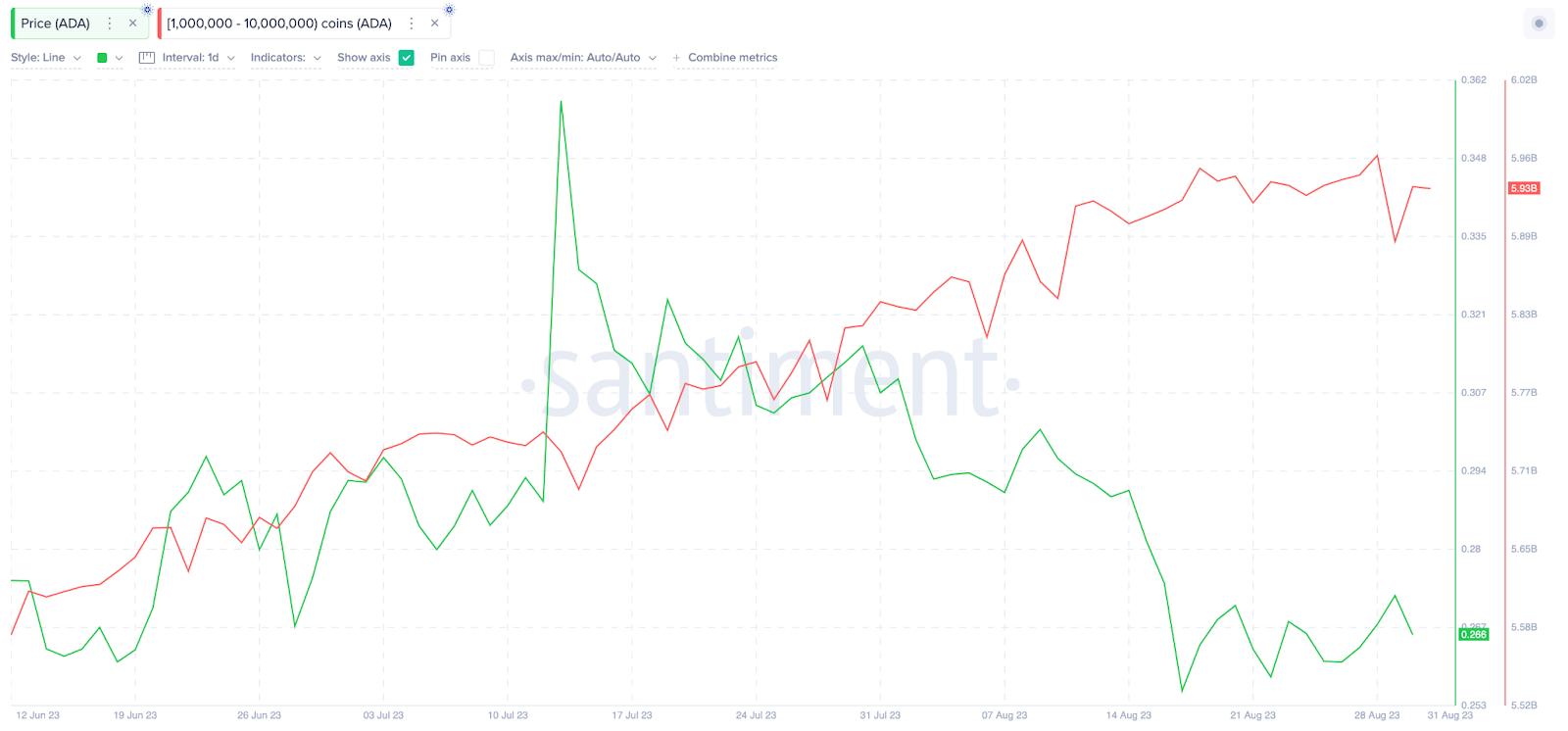 No entanto, desde que a juíza distrital dos EUA, Analisa Torres, decidiu que o XRP “não é um título”, as baleias começaram a acumular ADA, ignorando a tendência de baixa que estava em vigor. Entre 14 de julho e 1º de setembro, as baleias adicionaram 240 milhões de moedas aos seus saldos acumulados.