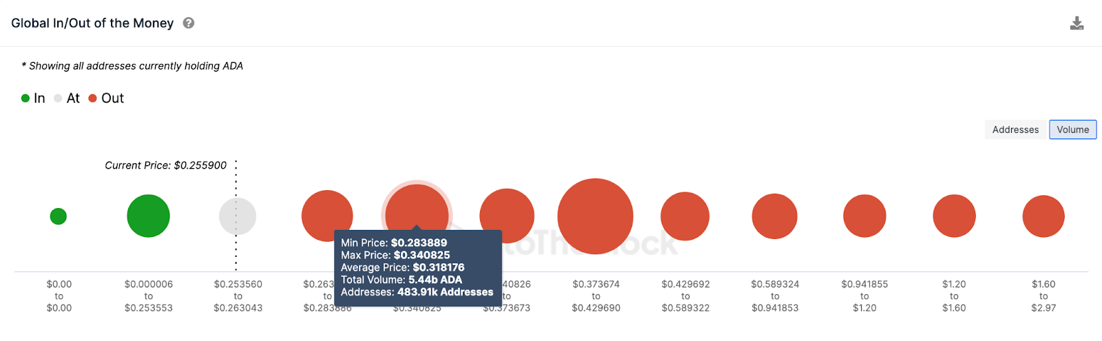 No entanto, destaca que o aumento do preço provavelmente enfrentará uma resistência considerável em torno do território de US$ 0,28. Conforme mostrado abaixo, os 484.000 detentores que compraram 5,44 bilhões de ADA ao preço mínimo de US$ 0,28. Poderiam fechar suas posições, o que pode desencadear uma reversão de baixa antecipada.