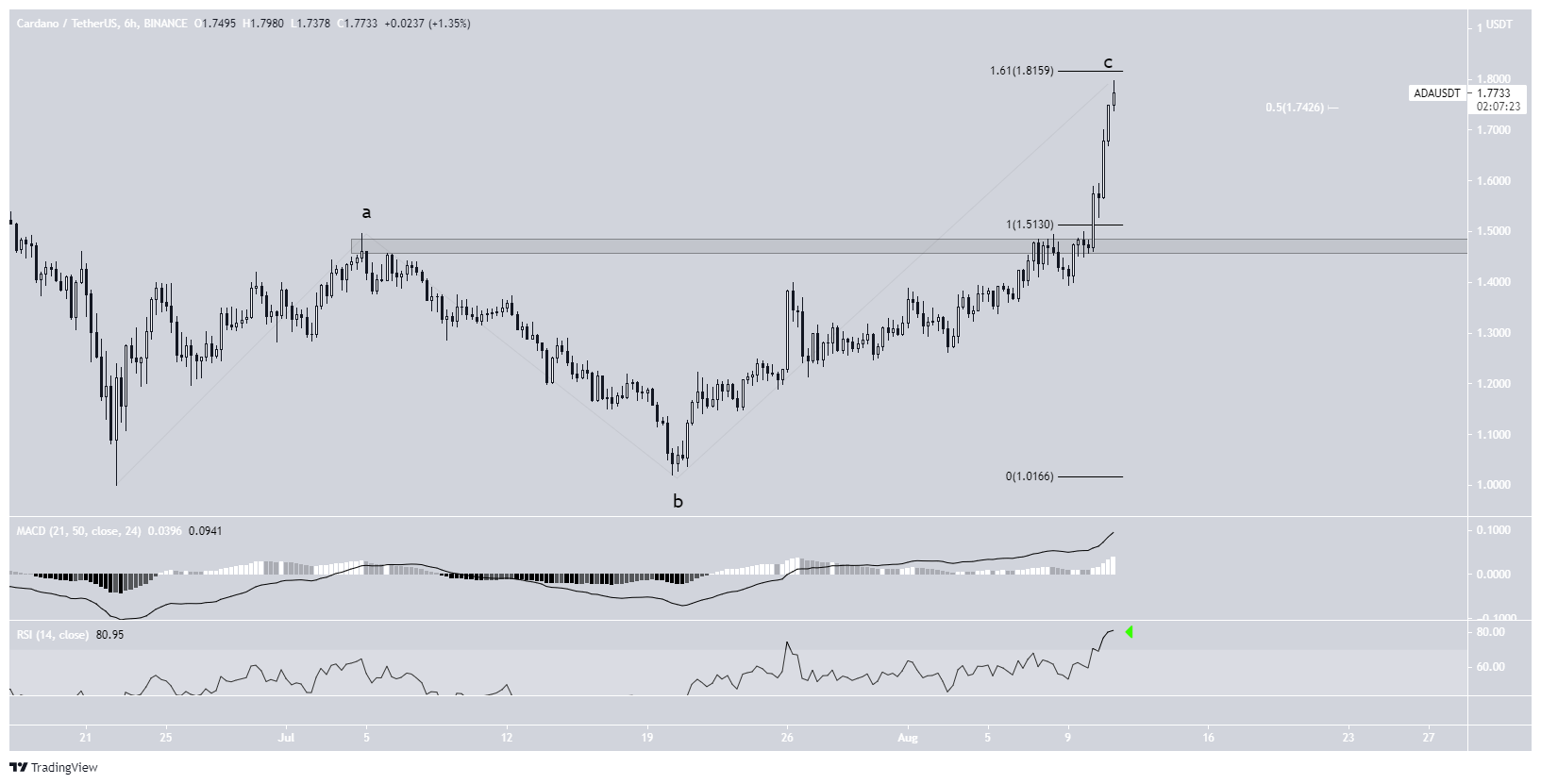 No entanto, a ADA conseguiu romper esta resistência no dia seguinte, criando um grande candle de alta que causou o rompimento da linha tendência mencionada acima. Até agora, ela atingiu uma alta de US$ 1,77 na manhã desta quarta-feira (11).