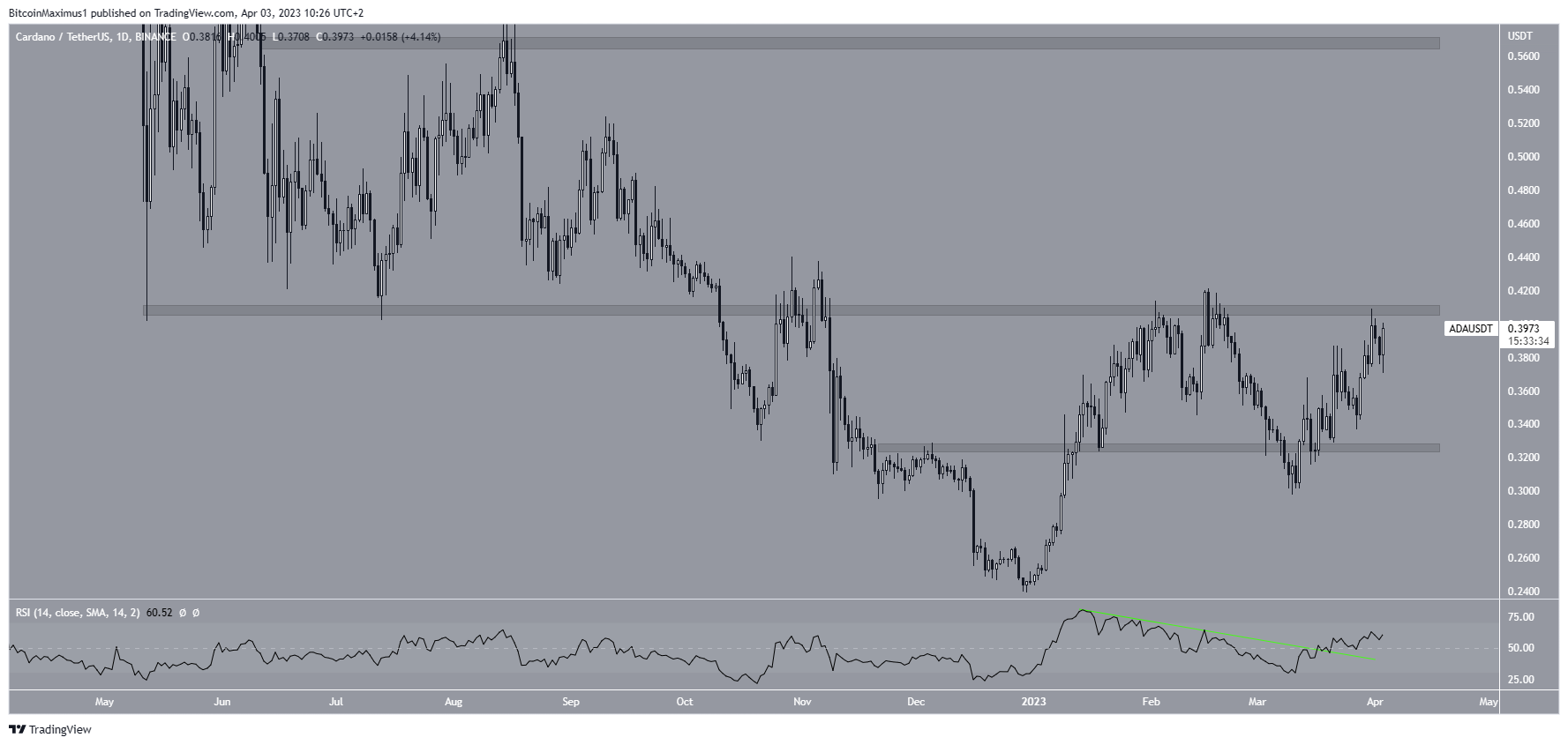 O preço da ADA tem subido desde o início do ano. Em 16 de fevereiro, atingiu uma nova máxima anual de US$ 0,421. Inicialmente, parecia que a alta causou um rompimento da área de resistência de US$ 0,410. Esta é uma área crucial que atua como resistência e suporte desde maio de 2022.