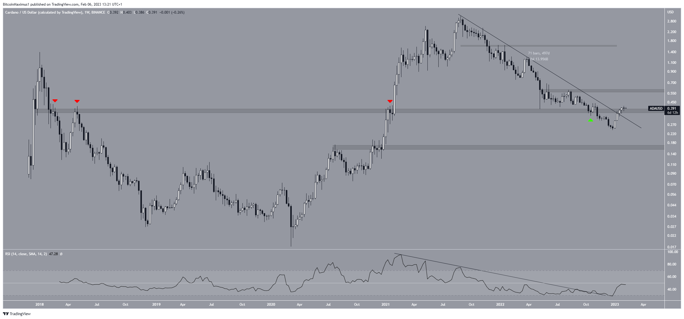 Em seguida, a ADA saiu de uma linha de resistência descendente que vigorava desde seu recorde de preço. No momento da fuga, a linha estava instalada há 497 dias. Este é outro sinal de que uma reversão de alta começou.