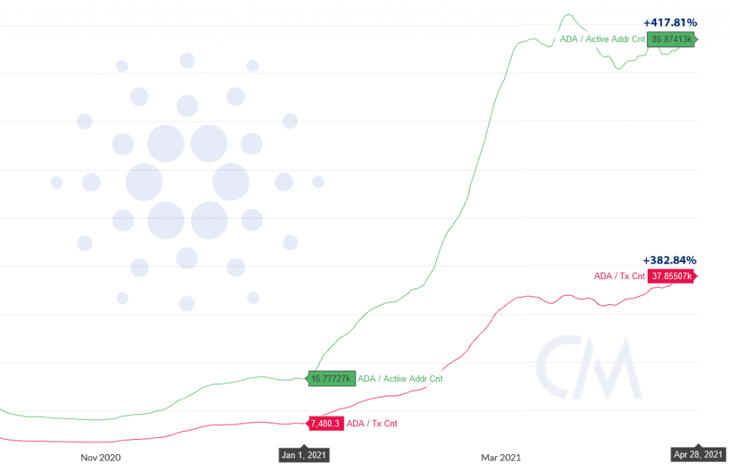 Durante os quatro primeiros meses de 2021, o número de carteiras ativas na rede Cardano cresceu 417,81%, o que reflete o interesse crescente e a sustentação do token ADA.