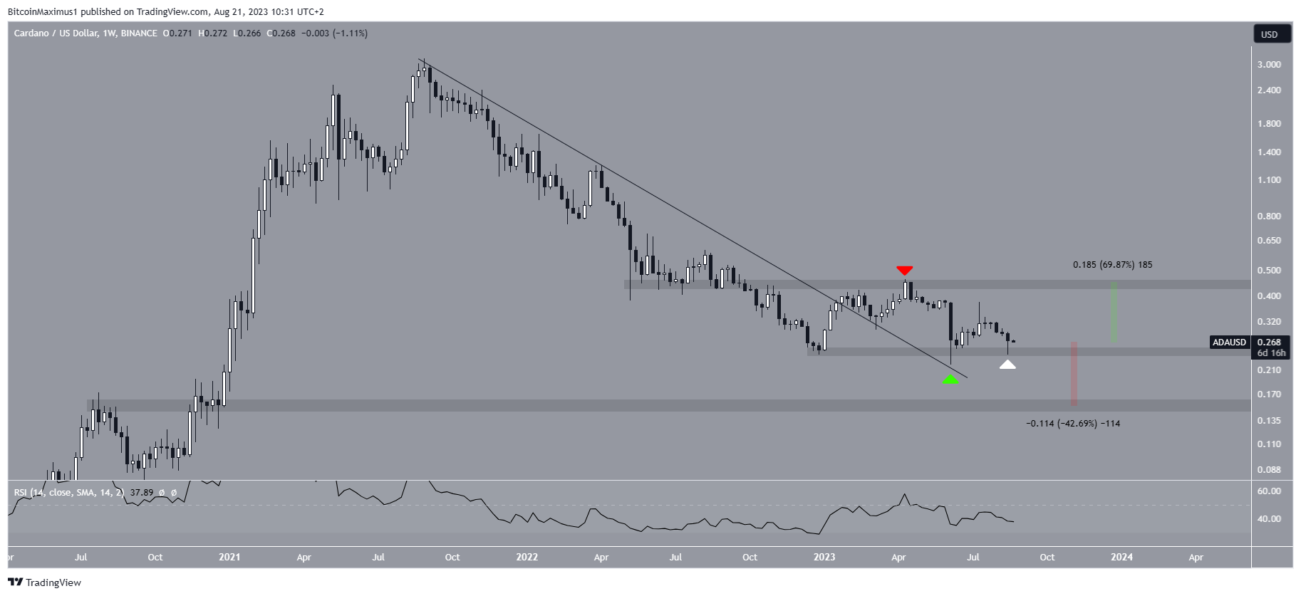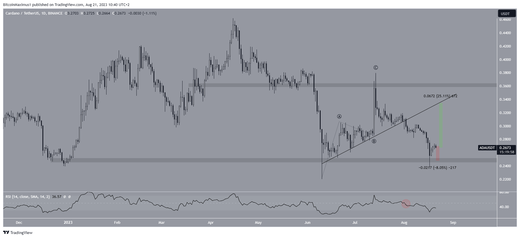 A Cardano (ADA) caiu de uma linha de tendência de alta em agosto. O preço caiu em direção as mínimas anuais, mas saltou, validando a área de suporte horizontal de US$ 0,25.