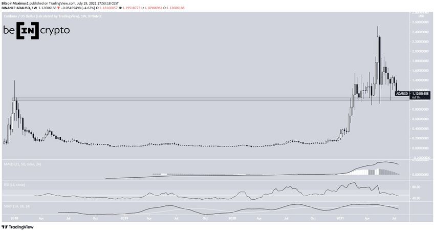 A Cardano (ADA) está em queda desde o dia 16 de maio, mas ainda é negociada acima da linha de suporte horizontal de US$ 1.
