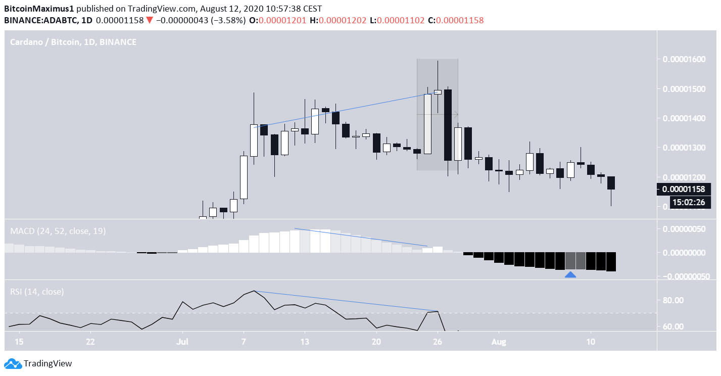 O par ADA / USD está sendo negociado dentro de uma pequena área de suporte acima de $ 0,12. O movimento dos preços desde março se assemelha a uma formação de cinco ondas, que pode ter terminado com uma alta de $ 0,1694 no dia 27 de julho. A alta foi combinada com uma divergência de baixa tanto no RSI quanto no MACD.
