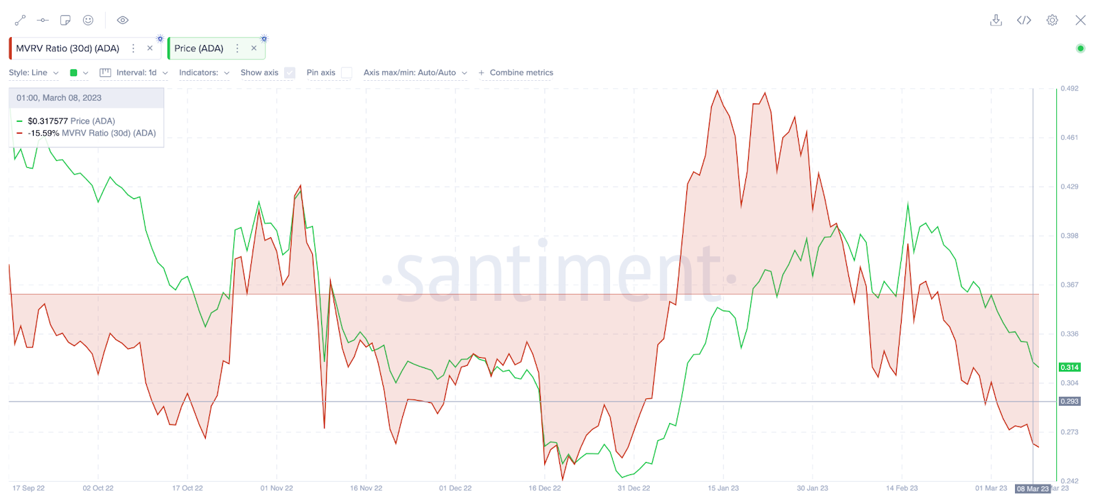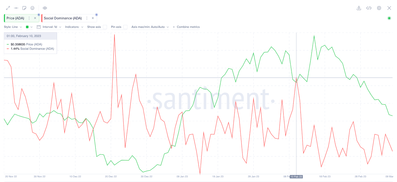 Em 16 de fevereiro, a ADA ultrapassou US$ 0,41, em um movimento de alta que elevou seu desempenho acumulado no ano acima de 67%. No entanto, em 7 de março, havia retraído 22% para US$ 0,32, o que levou o sentimento social entre os participantes da rede a uma espiral de baixa.