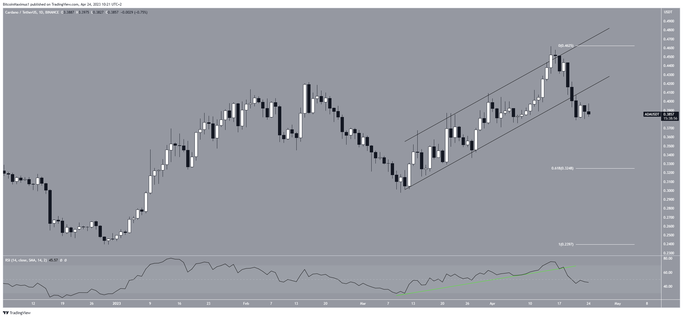 A análise técnica do gráfico diário também fornece uma previsão de preço para a Cardano. As razões para isso vêm tanto da ação do preço quanto das leituras dos indicadores. Em primeiro lugar, a ADA caiu de um canal paralelo de alta em 20 de abril. Anteriormente, o preço era negociado neste canal desde 10 de março.