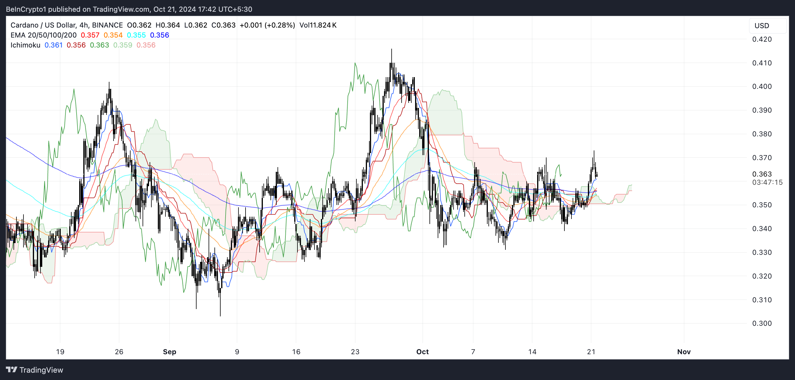 De acordo com seu gráfico de Nuvem de Ichimoku, Cardano (ADA) está em uma área crítica. O preço está atualmente perto da nuvem, sinalizando indecisão no mercado.
