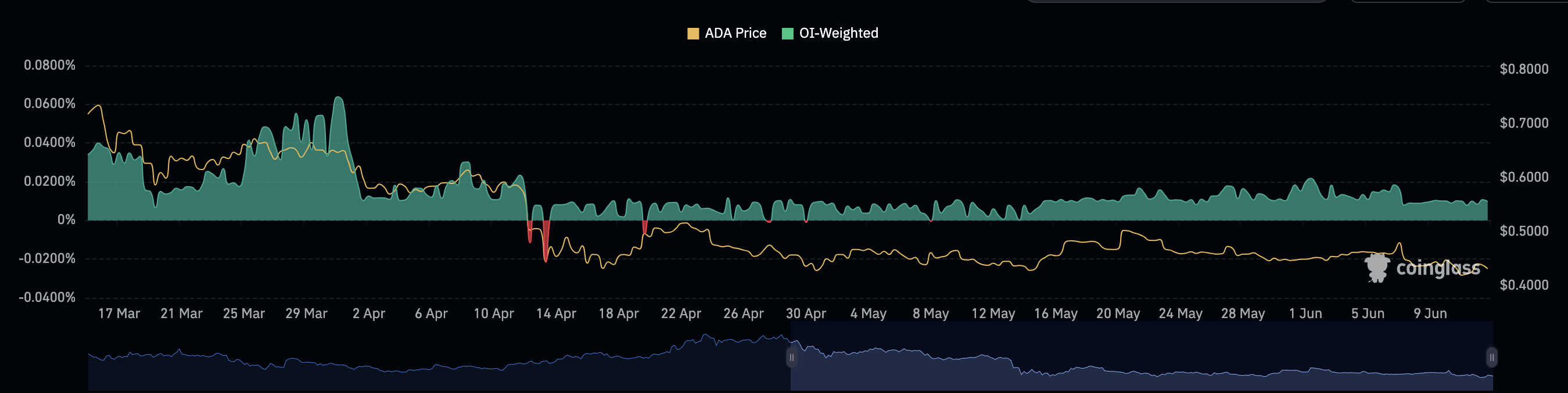 De acordo com a Coinglass, a taxa de financiamento da ADA foi positiva. Isso reforça a afirmação de que os traders colocaram posições altistas apesar do desempenho abaixo do esperado do token.