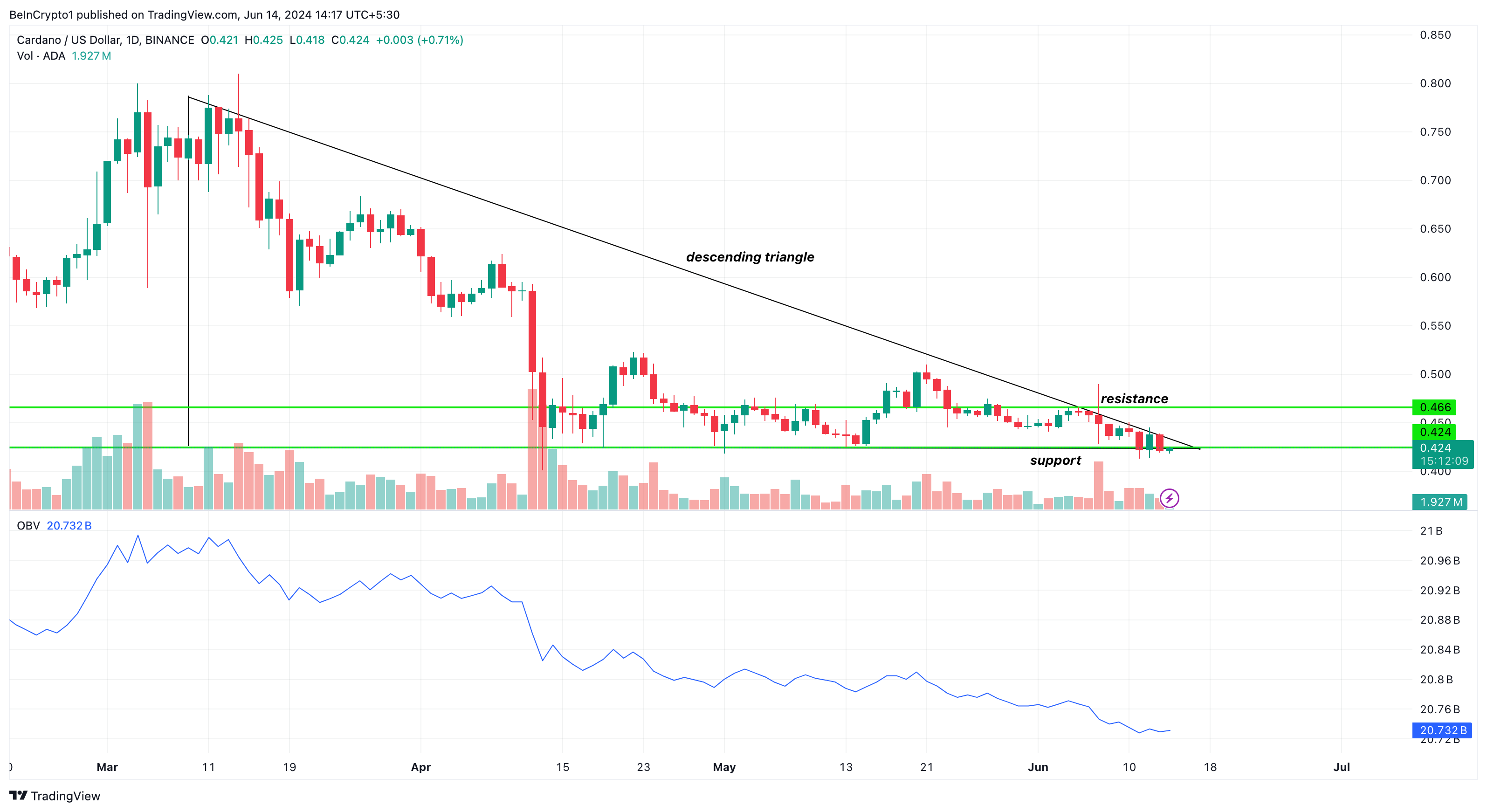Enquanto isso, o BeInCrypto analisou o potencial da criptomoeda no gráfico diário. De acordo com nossa análise, a ADA formou um triângulo descendente.