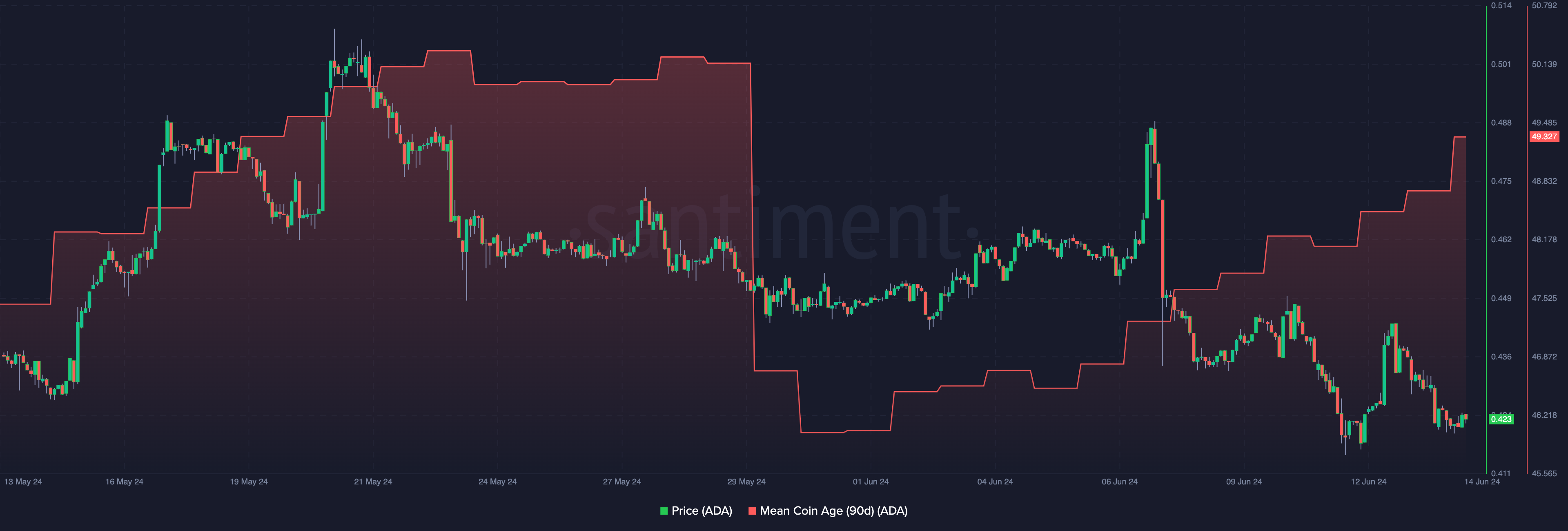 Por outro lado, uma baixa idade da moeda sugere o acúmulo de novas moedas. Na situação de Cardano, os dados da Santiment mostram que a MCA de 90 dias vem aumentando desde 1º de junho.