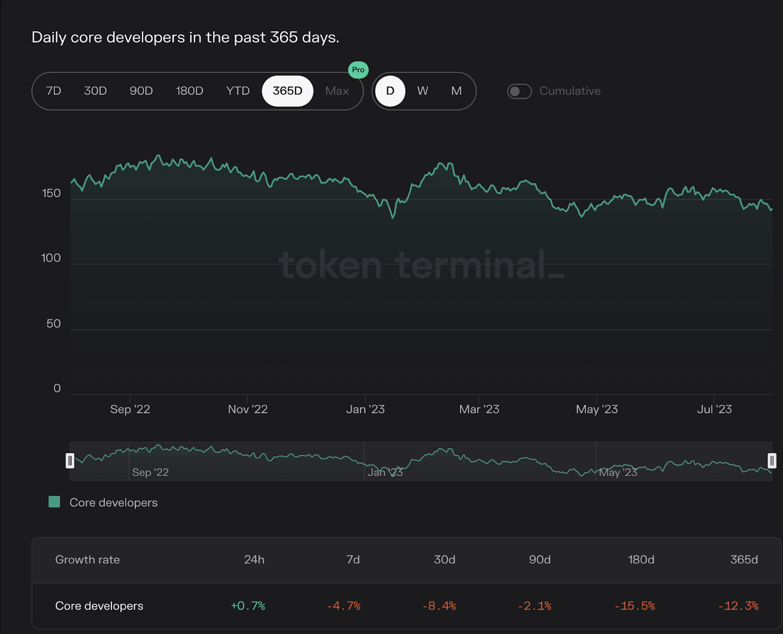 Embora a Cardano planeje trazer muitos aplicativos e casos de uso para o seu ecossistema, seus principais desenvolvedores estão diminuindo. A captura de tela abaixo mostra que os principais desenvolvedores da rede diminuíram cerca de 12,3% nos últimos 365 dias.