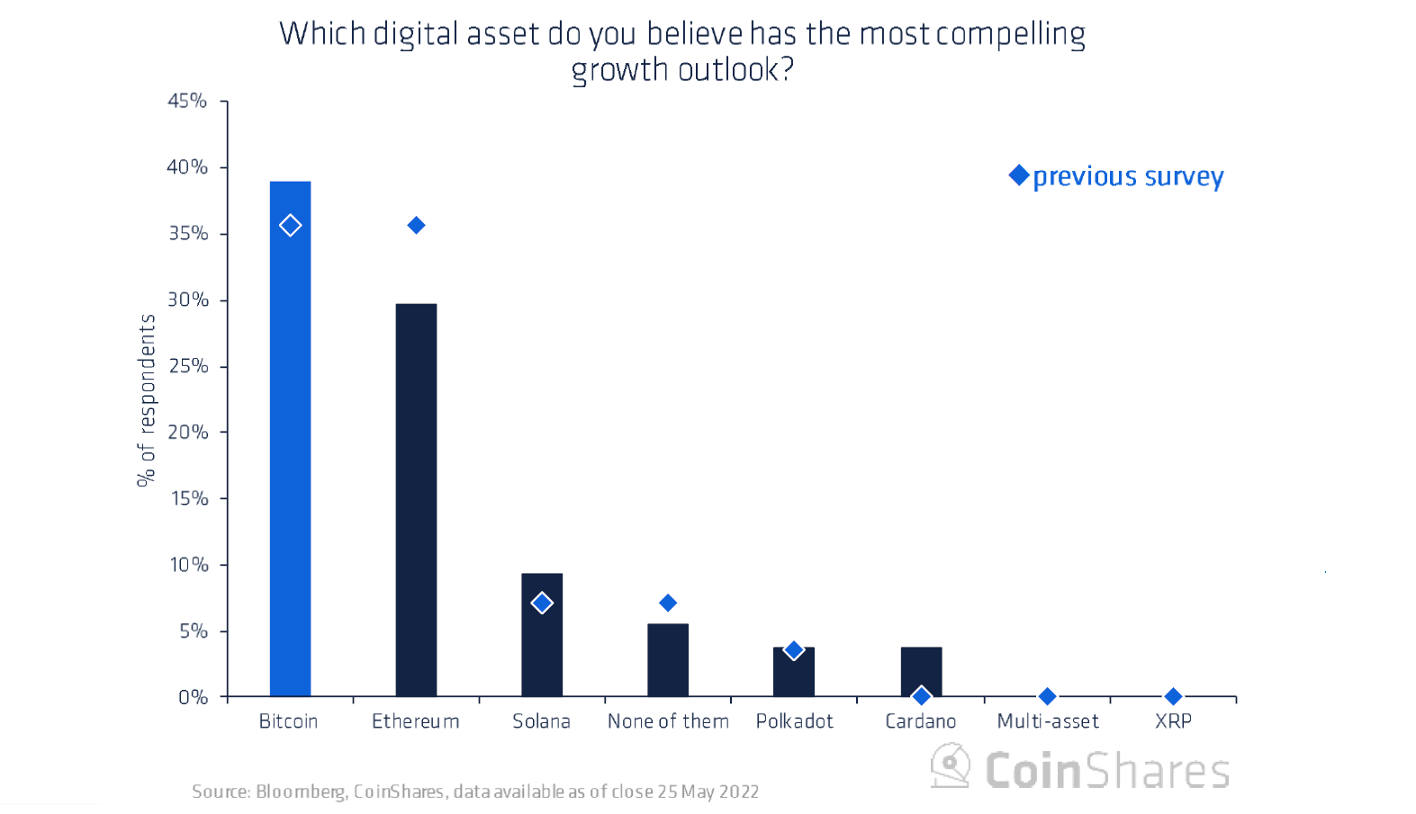 A pesquisa também revelou quais ativos os investidores já conseguem enxergar uma relação entre risco e retorno mais atraente. A Cardano se destaca novamente com um crescimento de 4% frente a pesquisa anterior. O Bitcoin saltou de 36% para 39%, um crescimento de 3%. Já o Ethereum teve uma queda de 6%, saindo de 36% para 30%.