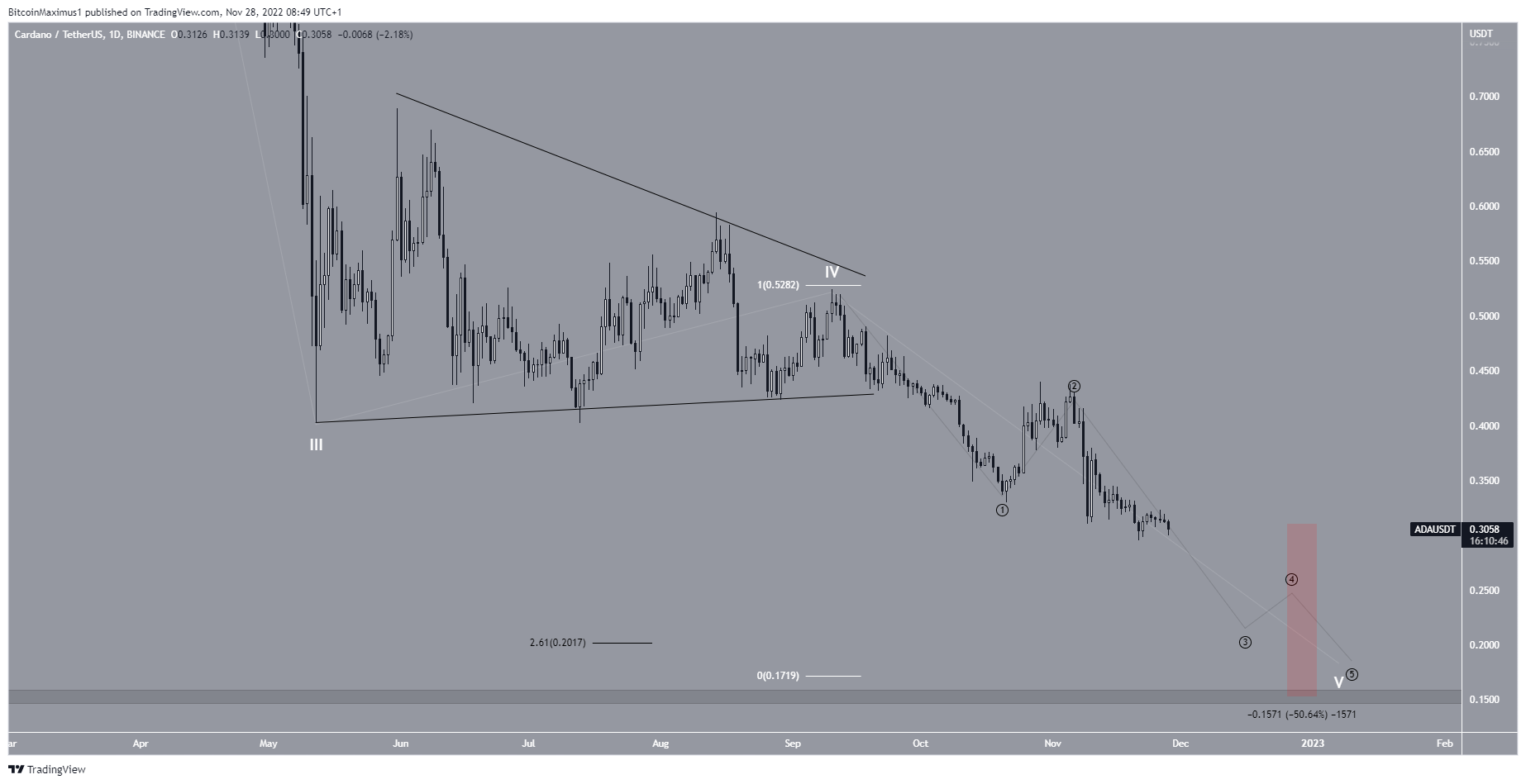 A contagem mais baixa indica que o preço da Cardano completou apenas a primeira parte da queda e o movimento descendente será retomado em direção a US$ 0,15.