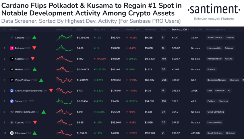 Apesar dos debates gerados na rede social de Elon Musk, a Cardano foi a blockchain com mais desenvolvimentos apresentados durante o mês de setembro. Segundo dados da Santiment, a rede ultrapassou a Polkadot (DOT) e Kusama (KSM) em desenvolvedores nos últimos 30 dias.