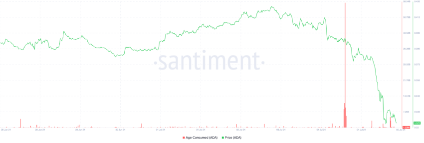 Em 4 de julho, 1,32 bilhão de moedas ADA, no valor aproximado de US$ 433 milhões aos preços atuais de mercado, foram movimentadas, conforme indicado pelo aumento em sua métrica Age Consumed.
