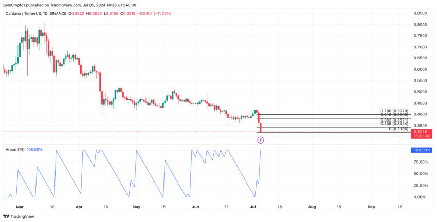 A ADA está em uma tendência de baixa desde o início de julho. Eles negociam a altcoin em seu preço atual, uma baixa vista pela última vez em novembro de 2023.