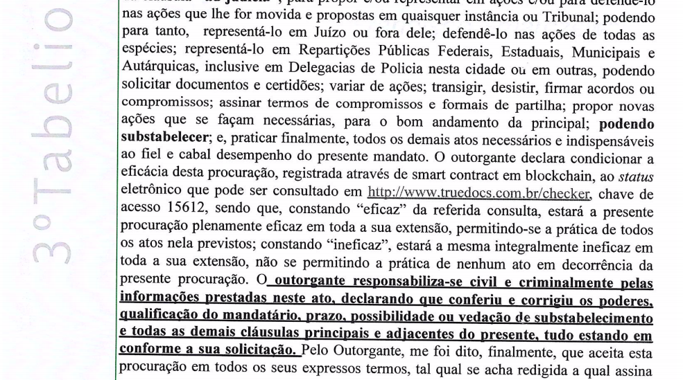 SponsoredO documento é uma procuração pública registrada em um tabelionato de notas. Ela se parece como outra qualquer, mas com uma diferença: só tem validez mediante consulta na blockchain.