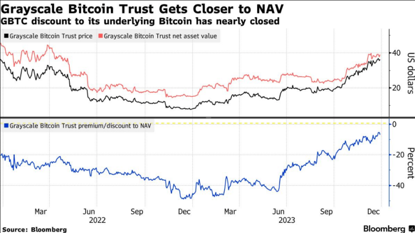 A CEO da ARK Invest, Cathie Wood, disse que a empresa vendeu suas ações do GBTC “por muita cautela” caso a Comissão de Valores Mobiliários dos EUA (SEC) não aprove o ETF ARK 21Shares Bitcoin em janeiro de 2024. O estreitamento das ações do GBTC na rede o valor do Bitcoin subjacente por ação tornou a venda lucrativa.