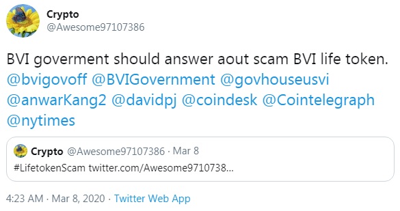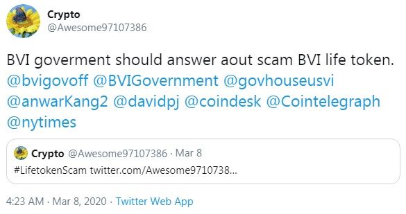 As autoridades alegaram que iriam emitir o token BVI ~ LIFE para moradores e turistas. Enquanto isso, o LIFElabs alegou que o token melhoraria a acessibilidade e também reduziria os custos transacionais. O recurso final de definição do token seria sua capacidade de implantar fundos rapidamente durante programas de resposta a desastres.