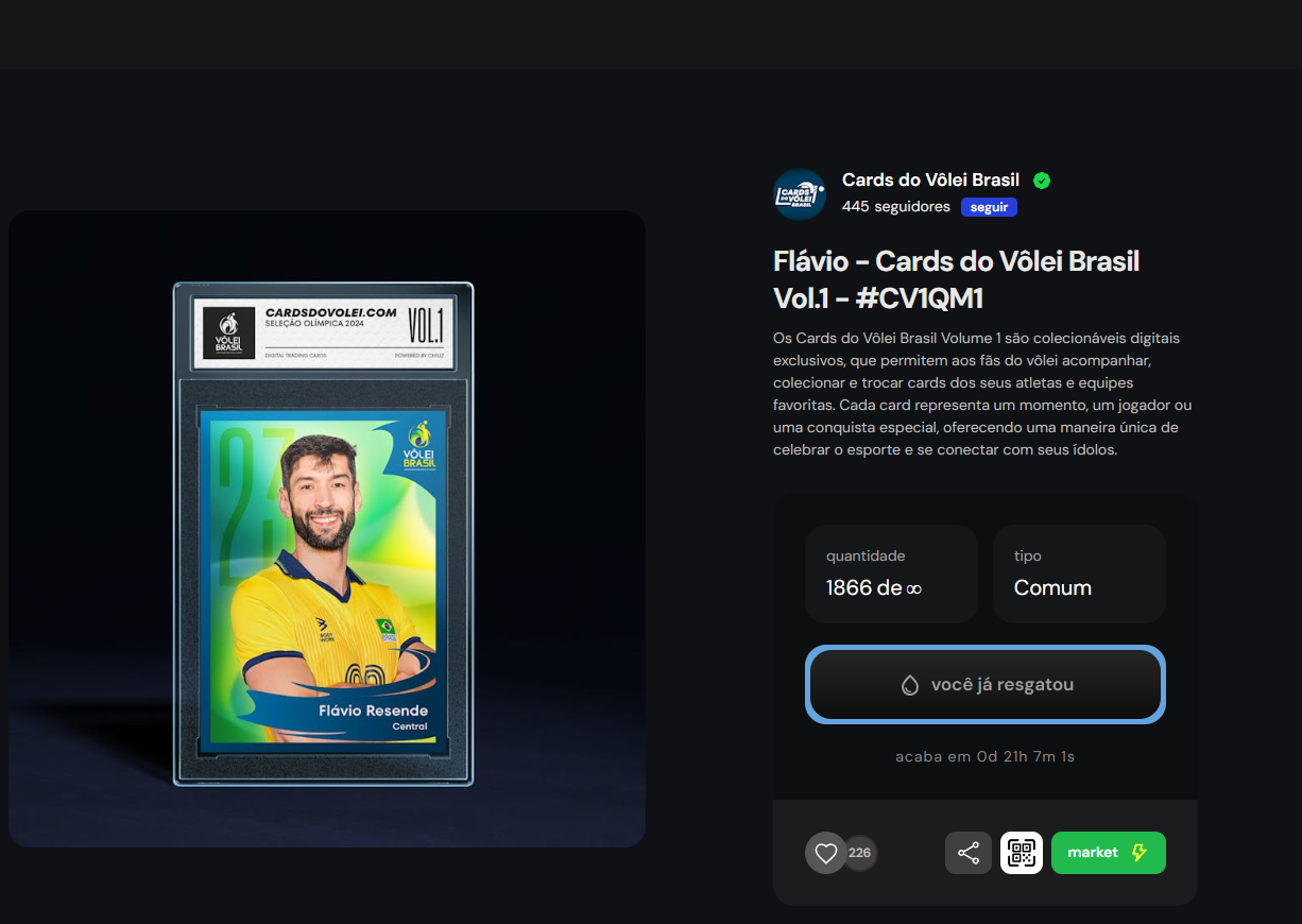 ALém disso, mais de 1860 pessoas já resgataram o NFT do Flavio Resende, central da equipe masculina de vôlei. Ao mesmo tempo, o NFT da Ana Carolina Silva já foi mintado por mais de 2.100 fãs.