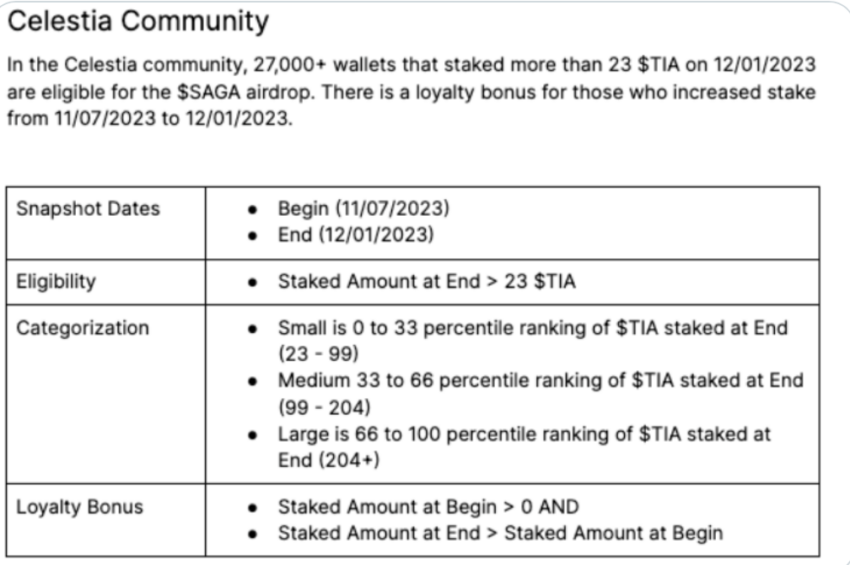 Além disso, a Saga revelou que mais de 27.000 carteiras que apostaram mais de 23 TIA em janeiro de 2023 são elegíveis para o airdrop de $SAGA.
