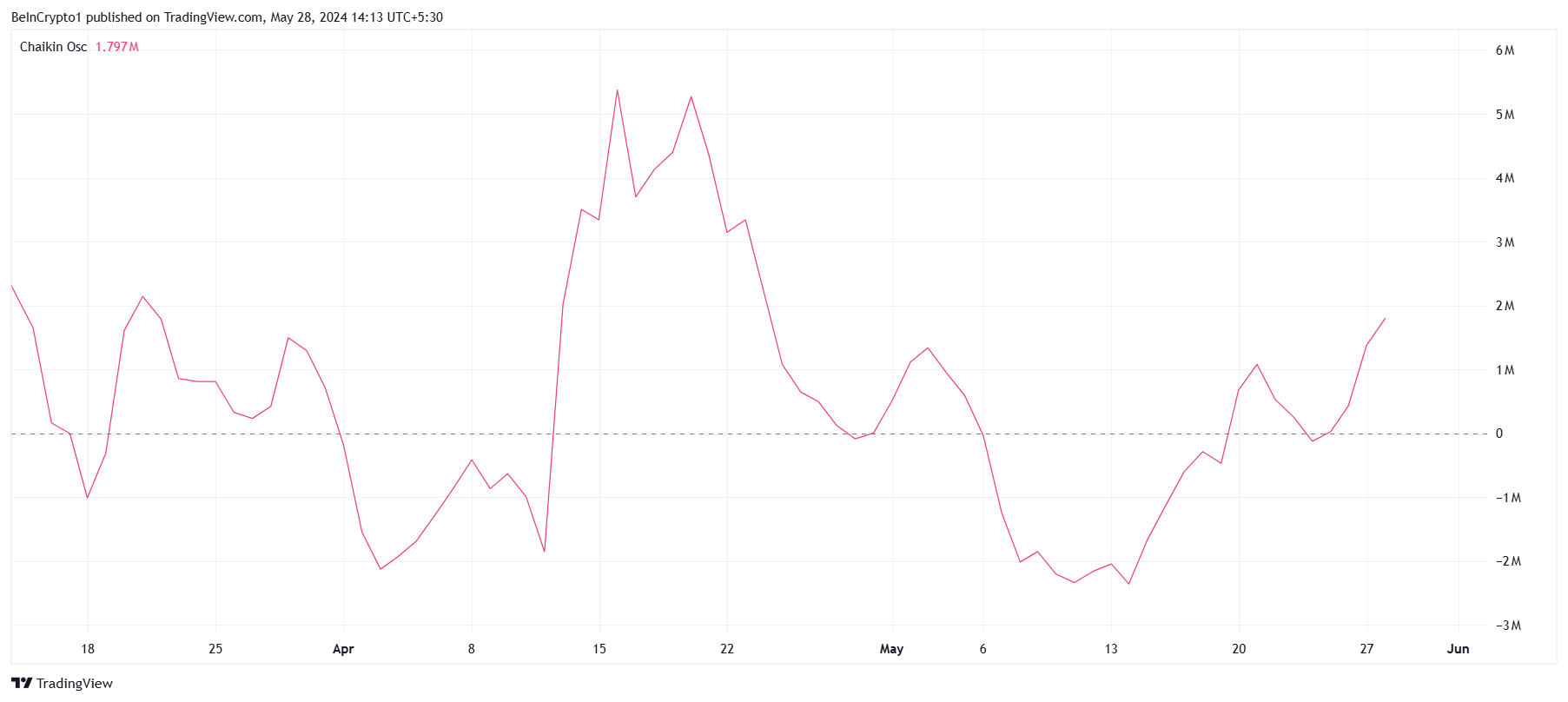 O preço da Celestia está reagindo ao recente aumento de otimismo dos investidores. Portanto, os detentores de TIA têm se concentrado na acumulação nas últimas duas semanas, o que é evidente no aumento do Oscilador Chaikin.