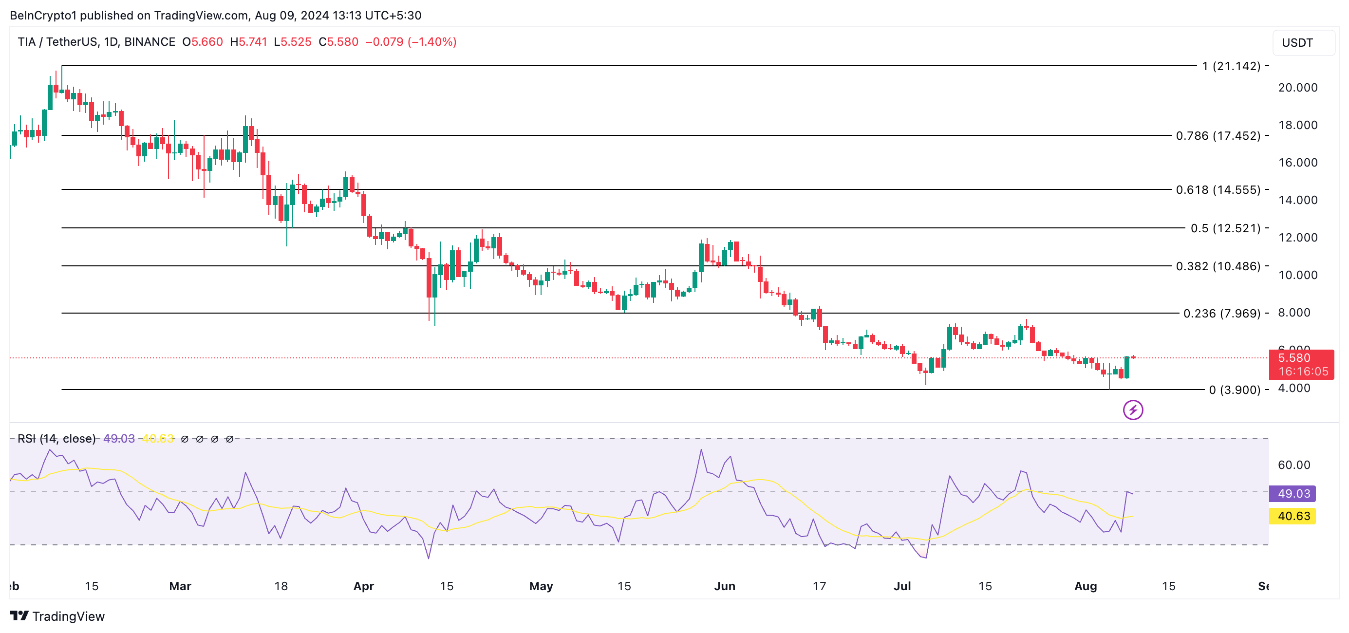 Até o momento, a TIA é negociada a US$ 5,58. No início da sexta-feira, a altcoin atingiu uma alta de sete dias de US$ 5,63 antes de sofrer uma ligeira correção.