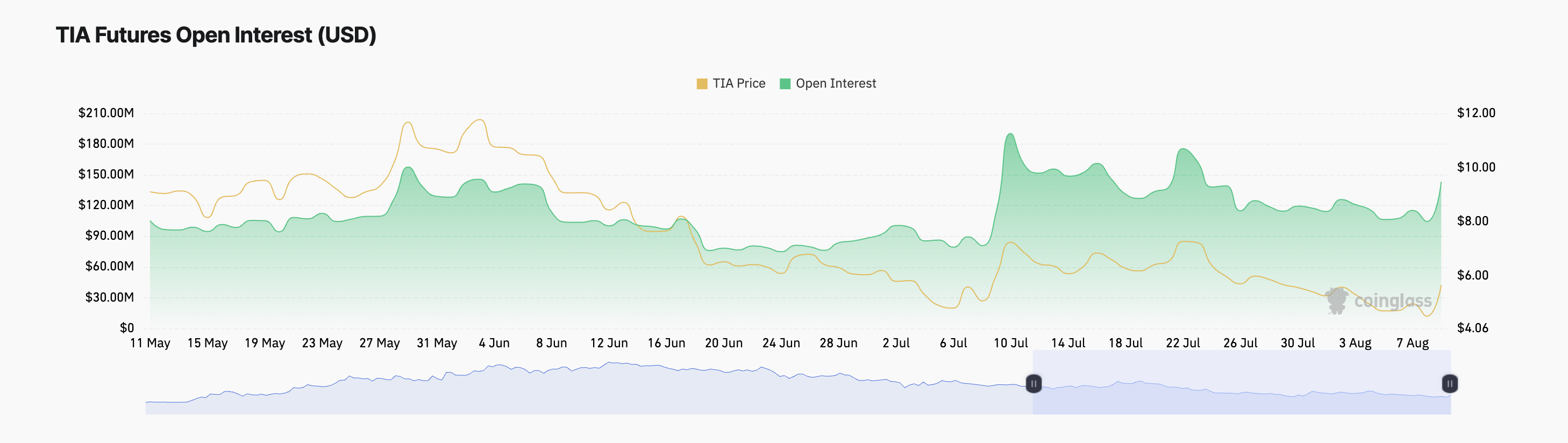 A Coinglass mostra que as taxas de financiamento da TIA permaneceram negativas desde 23 de julho, atualmente em -0,017%.