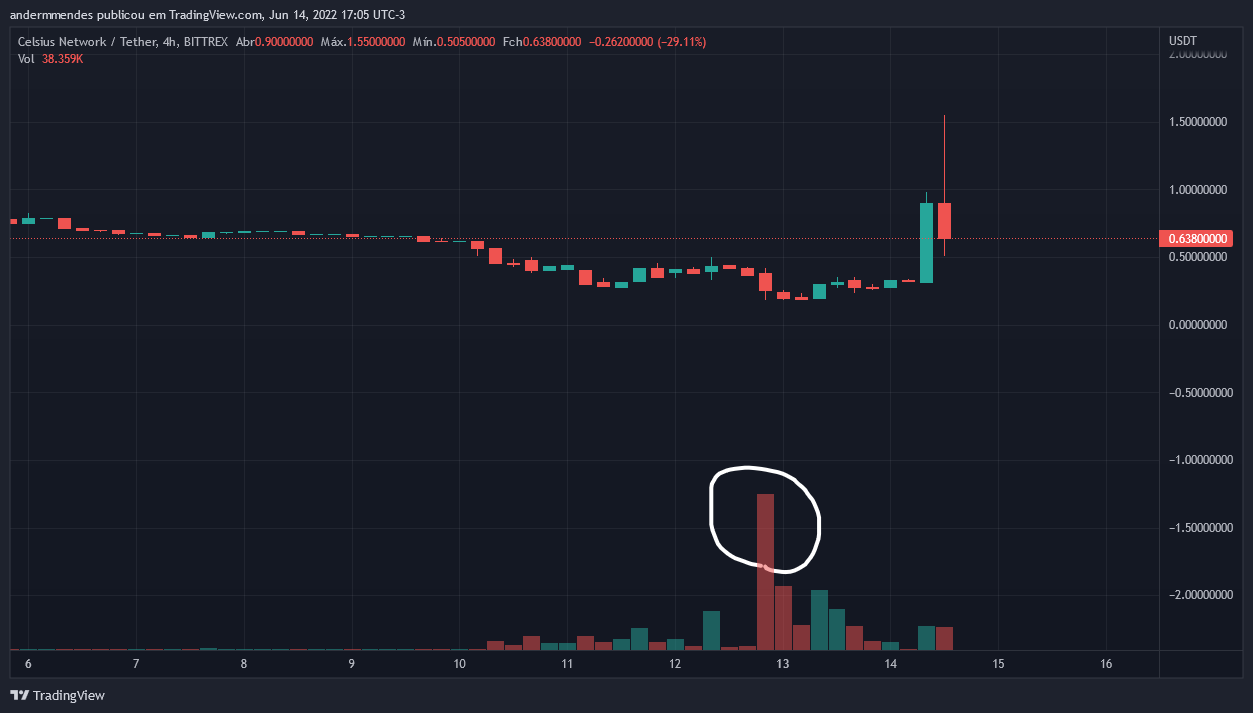 Curiosamente, conforme mostra o gráfico da movimentação de preço, o volume de negociações do CEL durante essa alta volatilidade foi muito baixo, especialmente quando comparado com o da noite do último domingo (12), quando a criptomoeda caiu cerca de 50% (círculo branco).