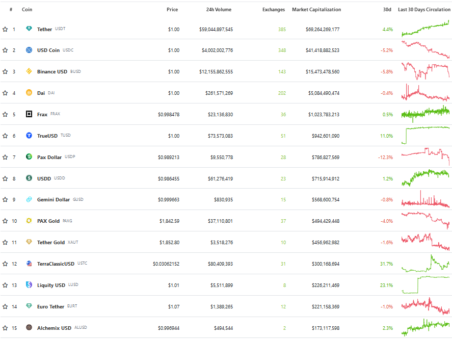 No ranking do CoinGecko das 15 maiores stablecoins em valor de mercado, somente três não são lastreadas a moeda norte-americana: o PAX Gold (PAXG) na 10º posição, o Tether Gold (XAUT) em 11º e o Euro Tether (EURT) em 14º lugar.
