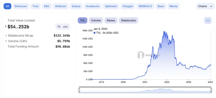À medida que o DeFi ganhou popularidade, o valor bloqueado no ecossistema aumentou significativamente, totalizando US$ 54,25 bilhões quando este artigo foi escrito.