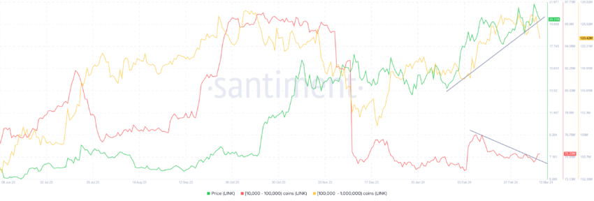 Pelo que parece, é provável que haja novas queda. Os investidores baleias da Chainlink, em particular, sinalizam uma tendência de baixa há algum tempo. Os endereços que detêm entre 10.000 e 100.000 LINK têm vendido de forma consistente desde o início de fevereiro.