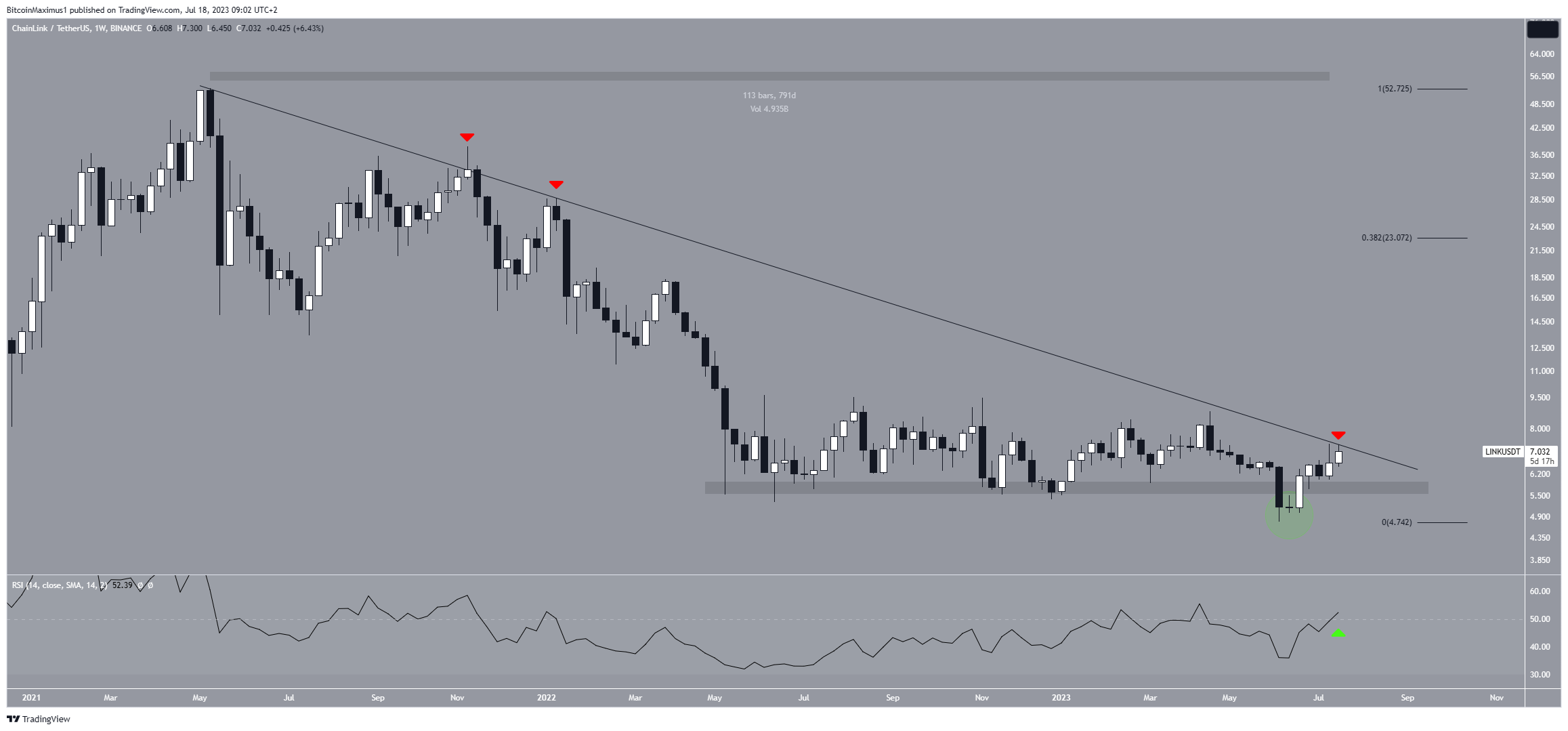 Isso se deve especialmente ao fato da LINK estar próxima de romper uma linha de tendência de baixa em vigor desde maio de 2021. Caso consiga realizar esse rompimento, a criptomoeda poderia entrar em uma tendência de alta de longo prazo rumo a novas máximas.