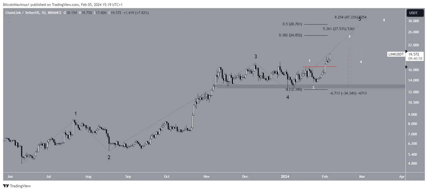 A contagem mais provável sugere que a LINK está na quinta e última onda de seu movimento de alta (preto). A contagem da subondas é dada em branco, sugerindo que o preço está na subonda três.