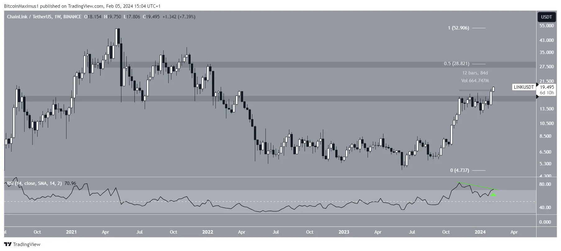 A análise técnica do gráfico semanal mostra que o preço da LINK subiu rapidamente desde junho de 2023.