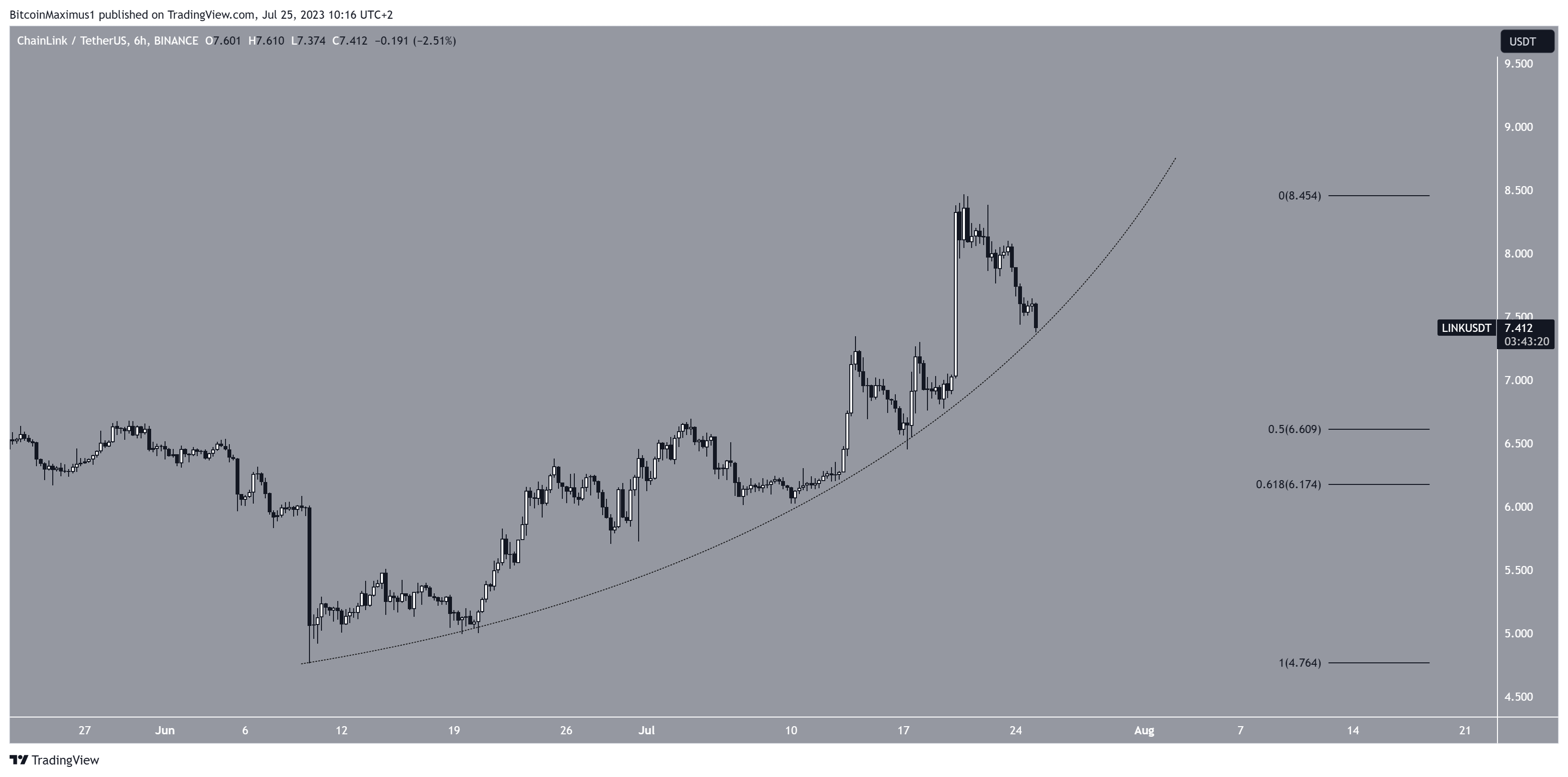 De acordo com o princípio dos níveis de retração de Fibonacci, após uma mudança significativa em uma direção, espera-se que o preço refaça parcialmente ou retorne a um nível anterior antes de retomar sua direção original. Portanto, espera-se que a LINK retome seu movimento de alta.