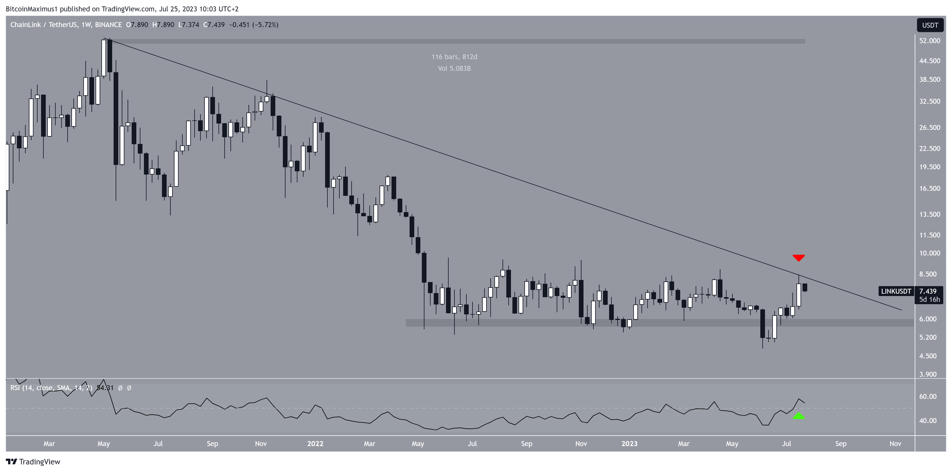 De acordo com a análise técnica do gráfico semanal, a LINK está abaixo de uma linha de tendência de baixa desde maio de 2021. Esse declínio resultou em uma mínima de US$ 4,75 em junho e parecia ter caído abaixo da área horizontal de US$ 6, estabelecida desde maio de 2022.