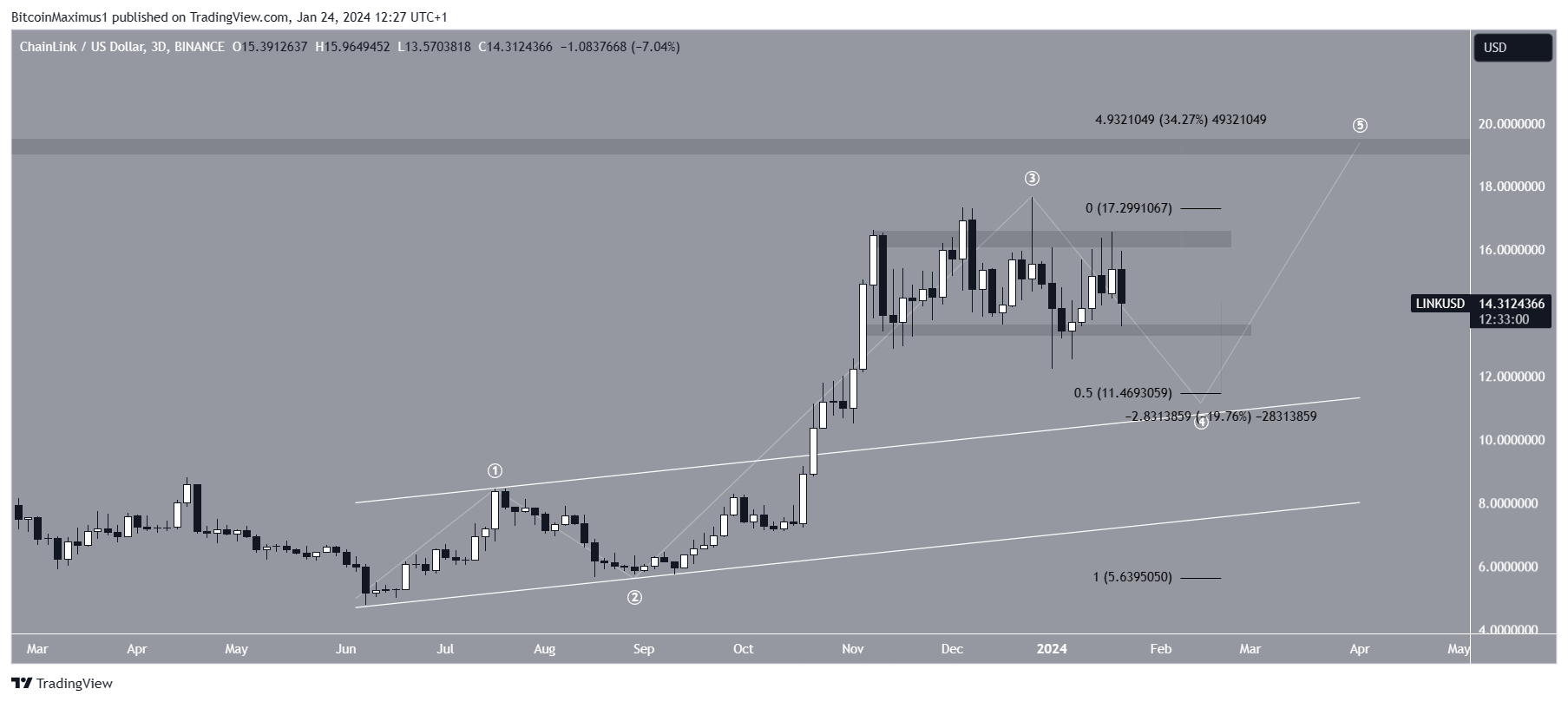 Se essa contagem estiver correta, a LINK cairá 20% para o nível de retração de 0,5 de Fibonacci, em US$ 11,45. Isto também validará a linha de resistência de um canal paralelo de alta de longo prazo.