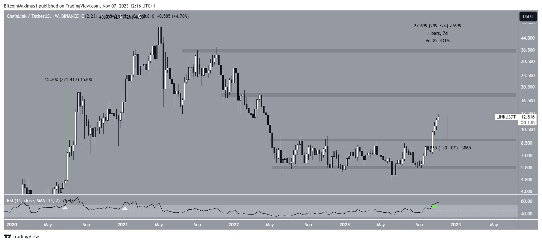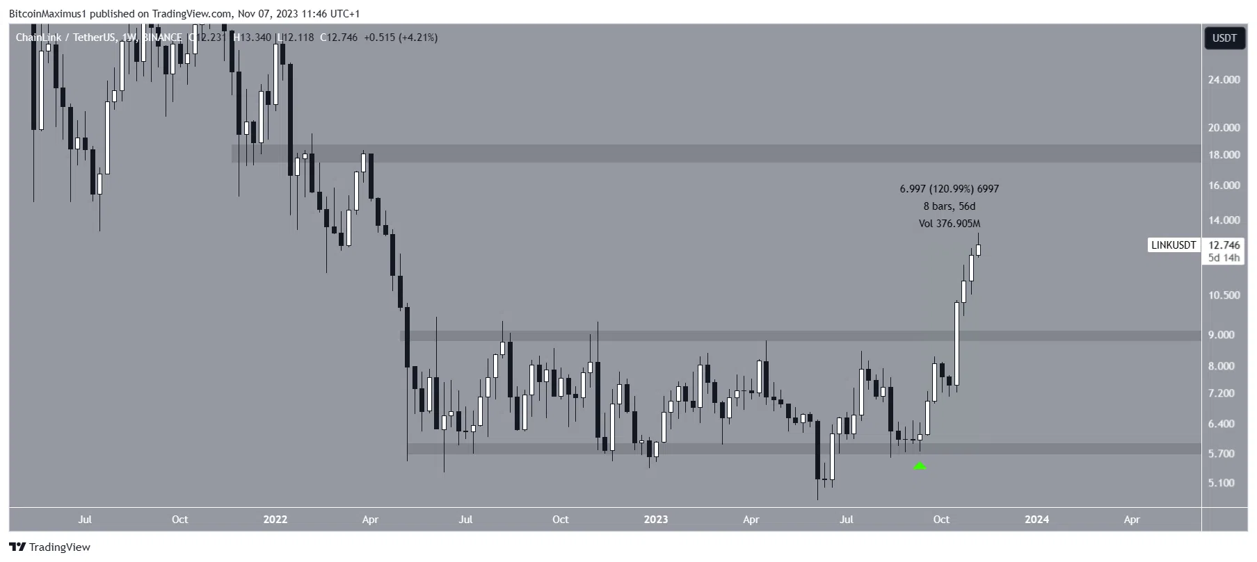 Desde então, a altcoin subiu 120% em menos de dois meses. Isso culminou com uma nova máxima anual de US$ 13,34 registrada nesta terça-feira (7). O movimento também causou um rompimento da faixa de acumulação, que vigorava há 530 dias.